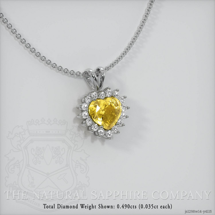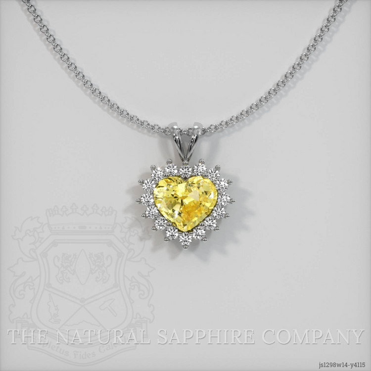 The pendant features a beautiful, transparent GIA certified Yellow 3.55 carat heart shape yellow sapphire with the dimensions of 8.57 x 9.85 x 5.58 mm and a modified brilliant cut. It has a clarity grade of very slightly included (evaluated at eye level), medium intense color saturation, and an excellent polish. The origin of this sapphire is Ceylon (Sri Lanka).