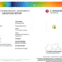 The pendant features a beautiful, transparent C.Dunaigre certified Yellow 7.26 carat princess shape yellow sapphire with the dimensions of 11.21 x 10.88 x 6.00 mm and a princess cut. It has a clarity grade of very slightly included (evaluated at eye level), medium intense color saturation, and an excellent polish. The origin of this sapphire is Ceylon (Sri Lanka).