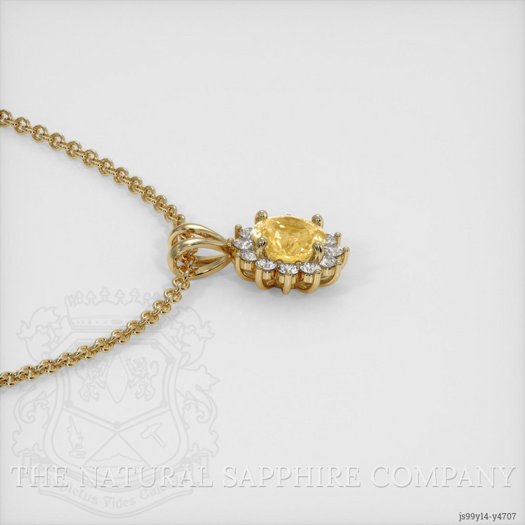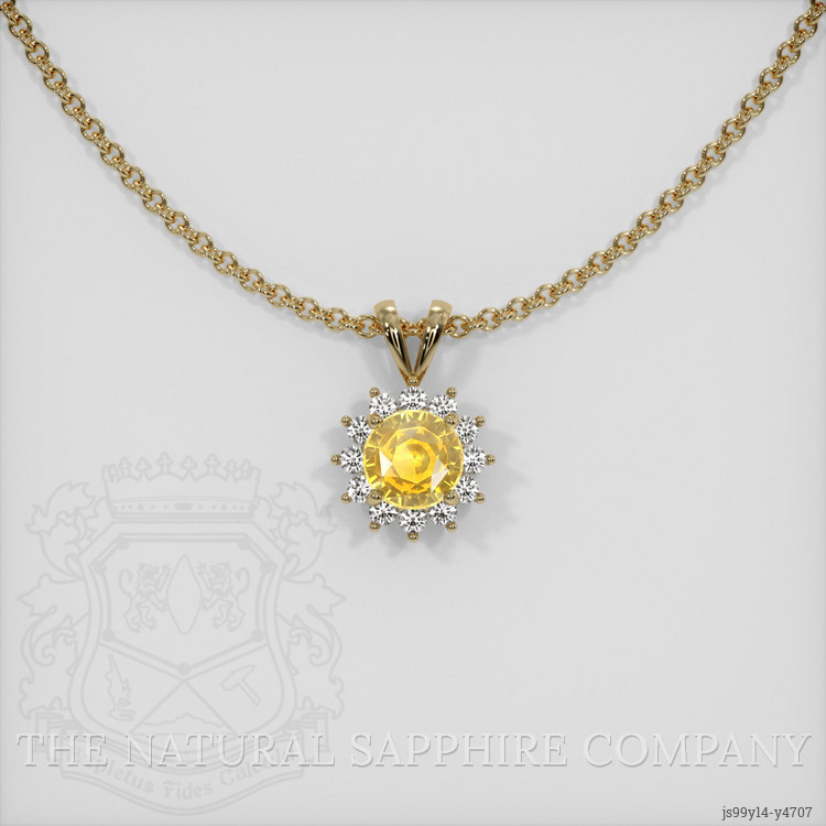 The pendant features a beautiful, transparent 2.05 carat round shape yellow sapphire with the dimensions of 7.39 x 7.31 x 4.72 mm and a mixed brilliant cut. It has a clarity grade of eye clean (evaluated at eye level), intense color saturation, and an excellent polish. The origin of this sapphire is Ceylon (Sri Lanka).