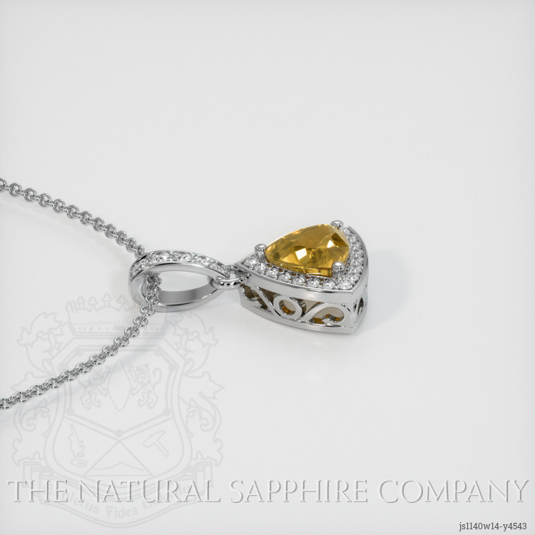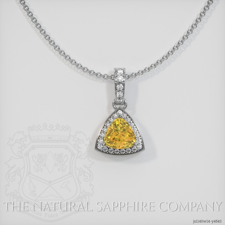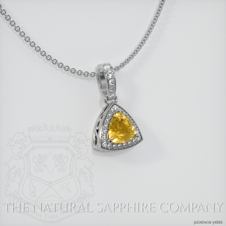 The pendant features a beautiful, transparent 1.84 carat trillion shape yellow sapphire with the dimensions of 7.06 x 6.96 x 4.96 mm and a trillion cut. It has a clarity grade of eye clean (evaluated at eye level), medium intense color saturation, and an excellent polish. The origin of this sapphire is Ceylon (Sri Lanka).