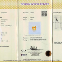 The ring features a beautiful, transparent Other certified Yellow 11.02 carat asscher - octagon shape yellow sapphire with the dimensions of 11.84 x 11.07 x 7.92 mm and a asscher cut. It has a clarity grade of very slightly included (evaluated at eye level), light color saturation, and an excellent polish. The origin of this sapphire is Ceylon (Sri Lanka).