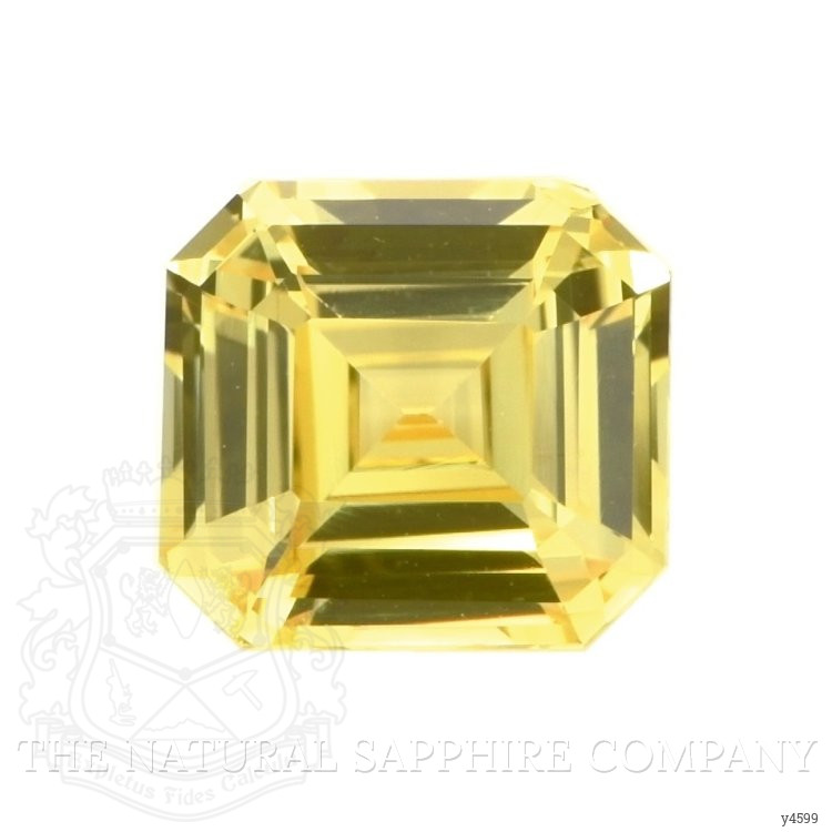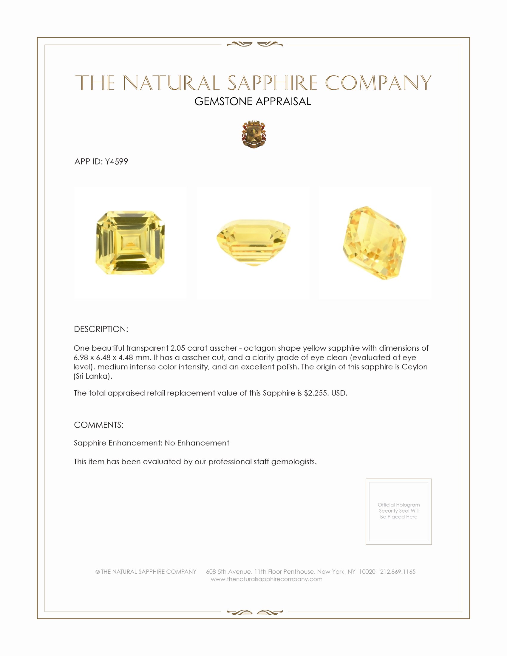 The ring features a beautiful, transparent 2.05 carat asscher - octagon shape yellow sapphire with the dimensions of 6.98 x 6.48 x 4.48 mm and a asscher cut. It has a clarity grade of eye clean (evaluated at eye level), medium intense color saturation, and an excellent polish. The origin of this sapphire is Ceylon (Sri Lanka).
