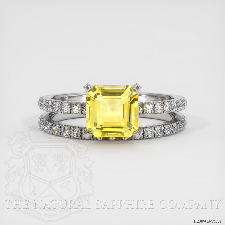 The ring features a beautiful, transparent 2.31 carat asscher - octagon shape yellow sapphire with the dimensions of 7.50 x 7.45 x 4.05 mm and a asscher cut. It has a clarity grade of very slightly included (evaluated at eye level), medium intense color saturation, and an excellent polish. The origin of this sapphire is Ceylon (Sri Lanka).