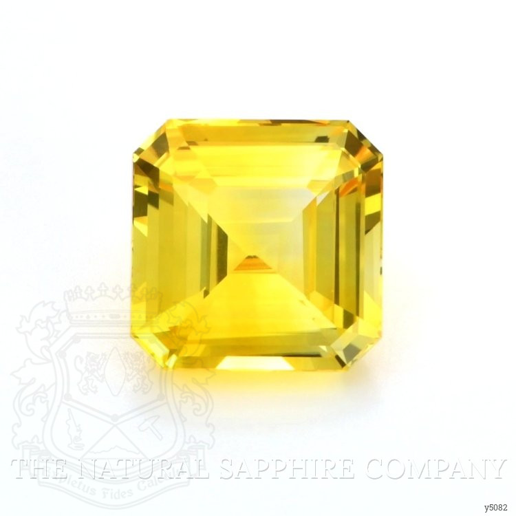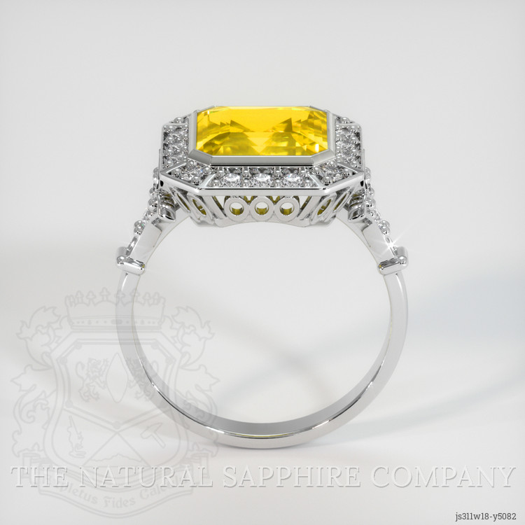 The ring features a beautiful, transparent C.Dunaigre certified Vivid Yellow 4.06 carat asscher shape yellow sapphire with the dimensions of 8.76 x 8.75 x 5.23 mm and a step cut. It has a clarity grade of eye clean (evaluated at eye level), vivid color saturation, and an excellent polish. The origin of this sapphire is Ceylon (Sri Lanka).