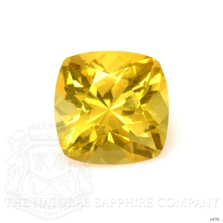The ring features a beautiful, transparent 0.72 carat cushion shape yellow sapphire with the dimensions of 5.15 x 5.10 x 3.65 mm and a mixed brilliant cut. It has a clarity grade of eye clean (evaluated at eye level), intense color saturation, and an excellent polish. The origin of this sapphire is Ceylon (Sri Lanka).
