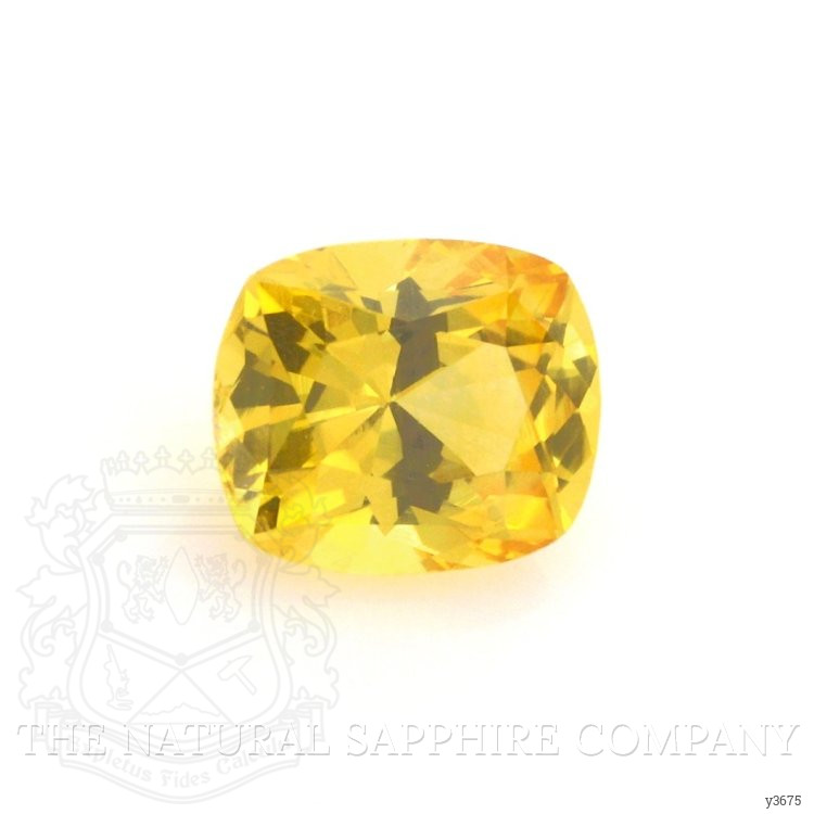 The ring features a beautiful, transparent 0.87 carat cushion shape yellow sapphire with the dimensions of 6.04 x 5.11 x 3.64 mm and a mixed brilliant cut. It has a clarity grade of very slightly included (evaluated at eye level), intense color saturation, and an excellent polish. The origin of this sapphire is Ceylon (Sri Lanka).