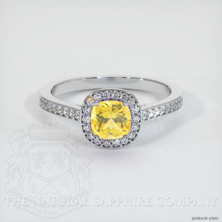 The ring features a beautiful, transparent 0.90 carat cushion shape yellow sapphire with the dimensions of 5.56 x 5.50 x 3.77 mm and a mixed brilliant cut. It has a clarity grade of eye clean (evaluated at eye level), medium intense color saturation, and an excellent polish. The origin of this sapphire is Ceylon (Sri Lanka).