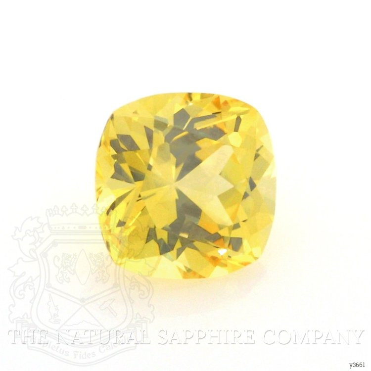 The ring features a beautiful, transparent 0.90 carat cushion shape yellow sapphire with the dimensions of 5.56 x 5.50 x 3.77 mm and a mixed brilliant cut. It has a clarity grade of eye clean (evaluated at eye level), medium intense color saturation, and an excellent polish. The origin of this sapphire is Ceylon (Sri Lanka).