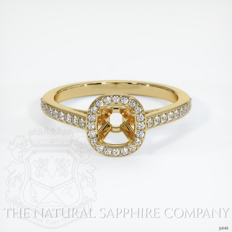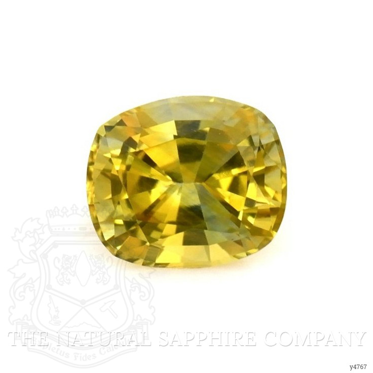 The ring features a beautiful, transparent 0.92 carat cushion shape yellow sapphire with the dimensions of 6.07 x 5.20 x 3.70 mm and a mixed brilliant cut. It has a clarity grade of eye clean (evaluated at eye level), intense color saturation, and an excellent polish. The origin of this sapphire is Ceylon (Sri Lanka).