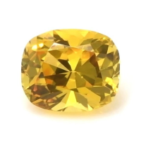 The men's ring features a beautiful, transparent 1.04 carat cushion shape yellow sapphire with the dimensions of 6.33 x 5.33 x 3.88 mm and a mixed brilliant cut. It has a clarity grade of eye clean (evaluated at eye level), medium intense color saturation, and an excellent polish. The origin of this sapphire is Ceylon (Sri Lanka).