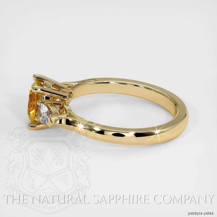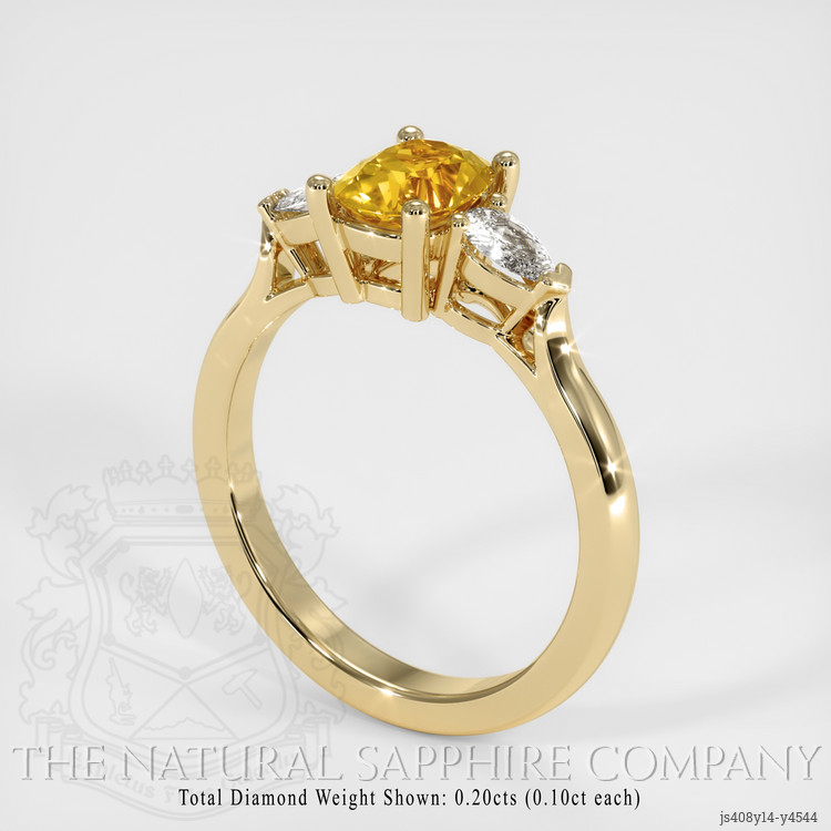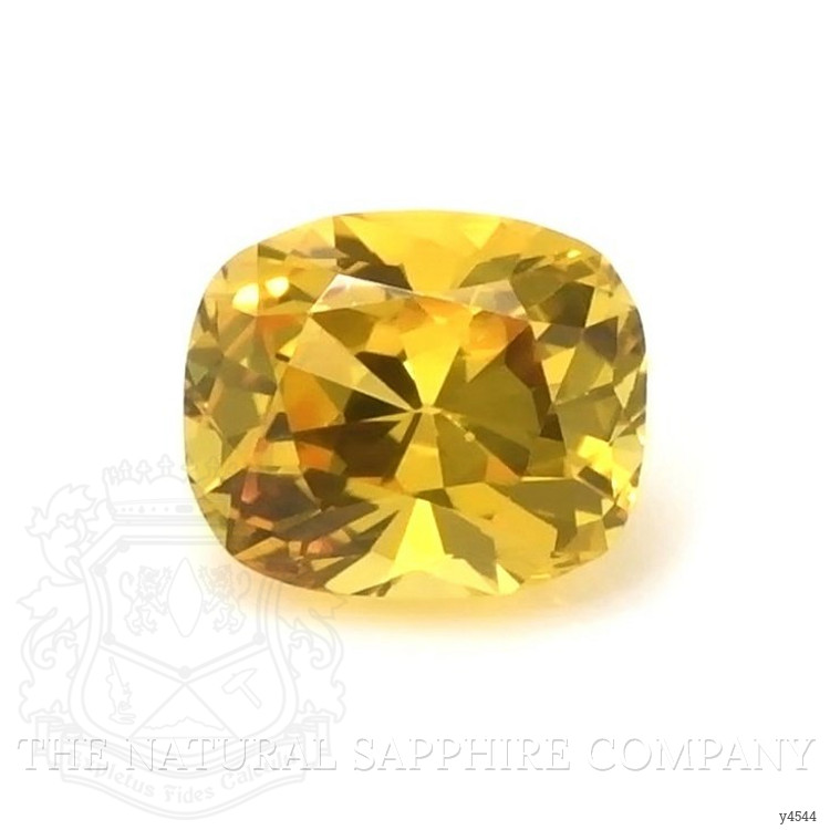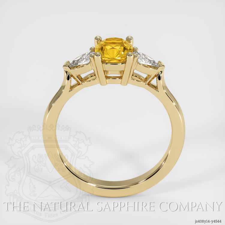 The ring features a beautiful, transparent 1.04 carat cushion shape yellow sapphire with the dimensions of 6.33 x 5.33 x 3.88 mm and a mixed brilliant cut. It has a clarity grade of eye clean (evaluated at eye level), medium intense color saturation, and an excellent polish. The origin of this sapphire is Ceylon(Sri Lanka).