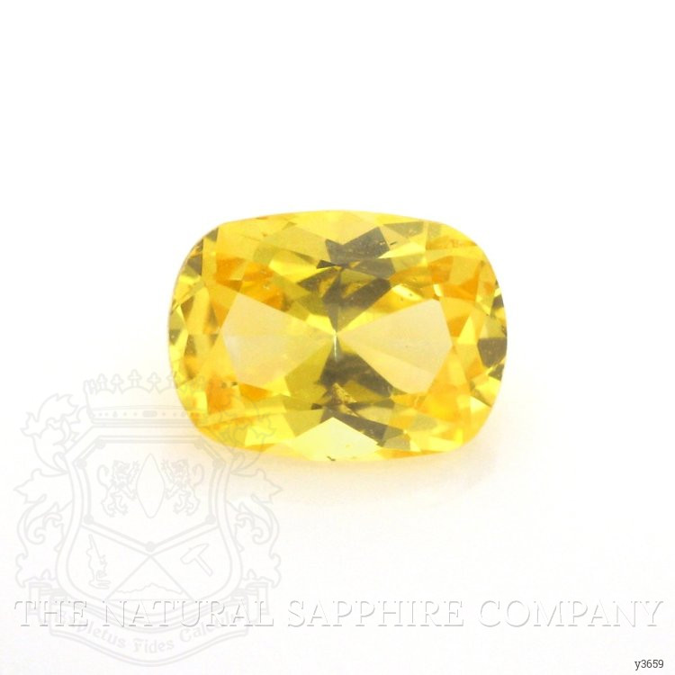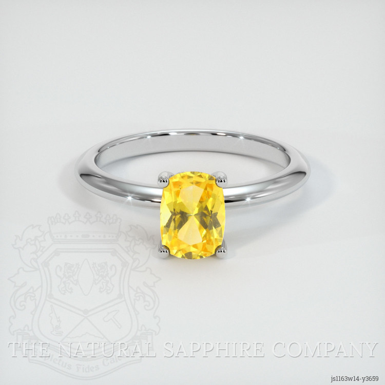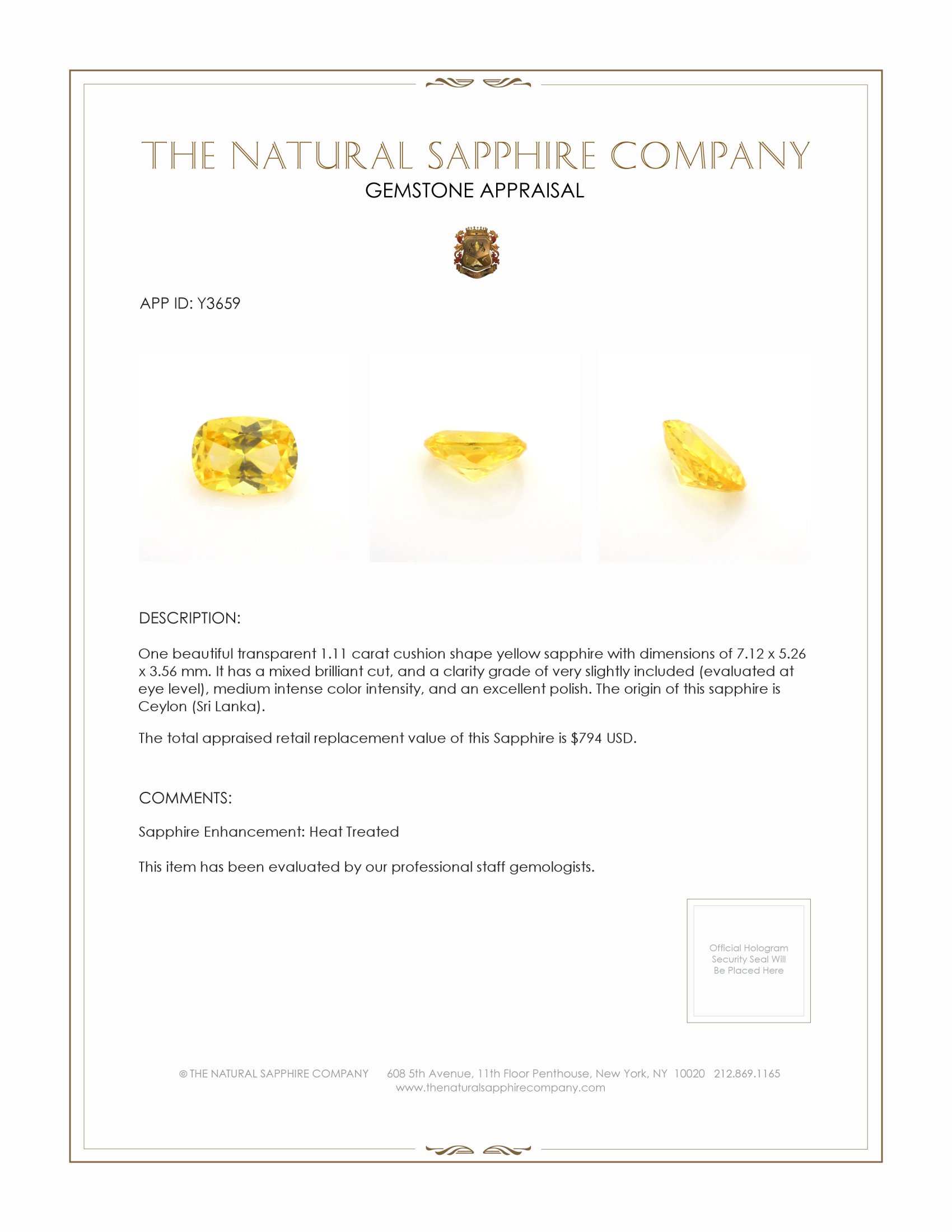 The ring features a beautiful, transparent 1.11 carat cushion shape yellow sapphire with the dimensions of 7.12 x 5.26 x 3.56 mm and a mixed brilliant cut. It has a clarity grade of very slightly included (evaluated at eye level), medium intense color saturation, and an excellent polish. The origin of this sapphire is Ceylon (Sri Lanka).