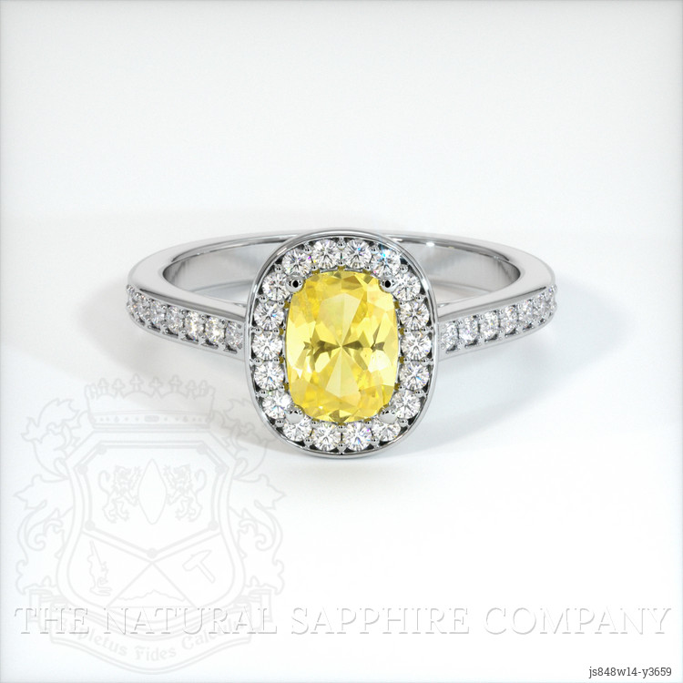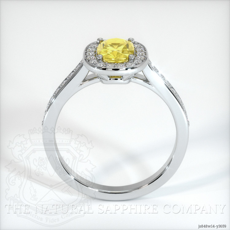The ring features a beautiful, transparent 1.11 carat cushion shape yellow sapphire with the dimensions of 7.12 x 5.26 x 3.56 mm and a mixed brilliant cut. It has a clarity grade of very slightly included (evaluated at eye level), medium intense color saturation, and an excellent polish. The origin of this sapphire is Ceylon (Sri Lanka).