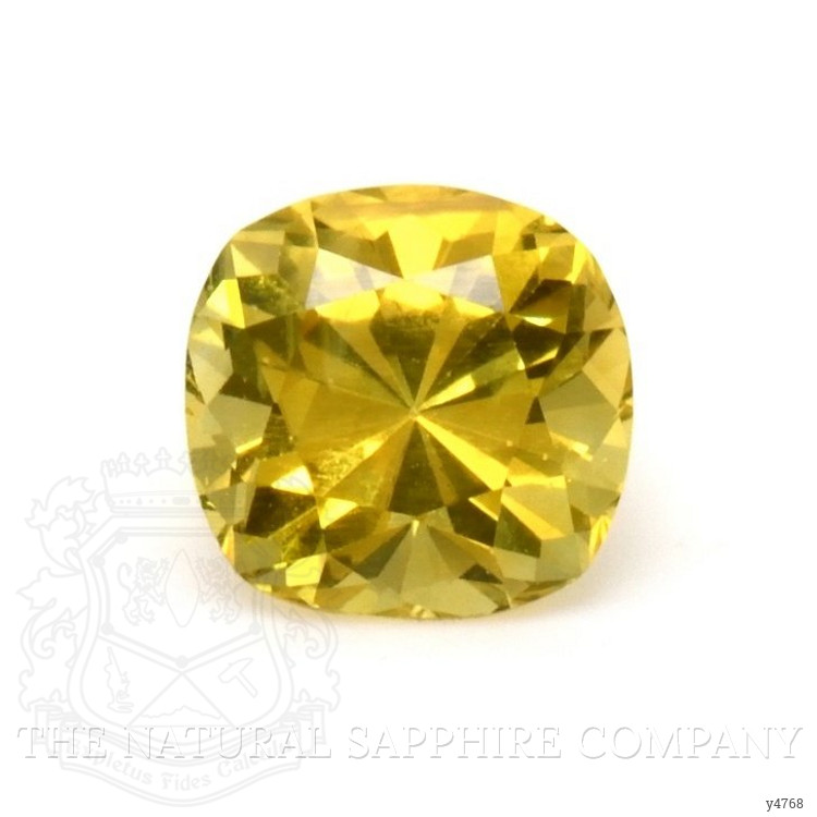 The ring features a beautiful, transparent 1.21 carat cushion shape yellow sapphire with the dimensions of 6.09 x 5.92 x 4.43 mm and a mixed brilliant cut. It has a clarity grade of very slightly included (evaluated at eye level), intense color saturation, and an excellent polish. The origin of this sapphire is Ceylon (Sri Lanka).