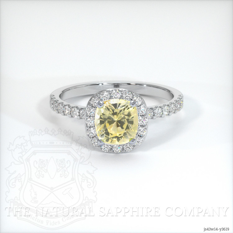 The ring features a beautiful, transparent 1.27 carat cushion shape yellow sapphire with the dimensions of 6.21 x 5.80 x 4.41 mm and a mixed brilliant cut. It has a clarity grade of slightly included (evaluated at eye level), medium intense color saturation, and an excellent polish. The origin of this sapphire is Ceylon (Sri Lanka).