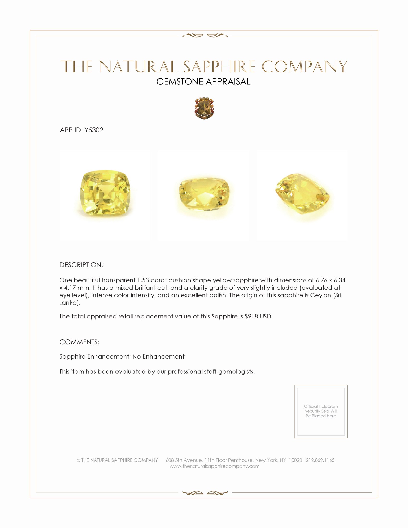 At The Natural Sapphire Company, we believe that every piece of jewelry tells a story, and this exquisite ring is no exception. At its heart lies a breathtaking transparent 1.53 carat cushion-shaped yellow sapphire, whose intense color saturation echoes the warmth and joy of a glowing sunrise. With dimensions of 6.76 x 6.34 x 4.17 mm, this sapphire has been masterfully cut with a mixed brilliant technique, ensuring that it dazzles with every movement. Originating from the celebrated lands of Ceylon, known today as Sri Lanka, this gemstone holds a piece of ancient earth within it, expertly crafted to echo the romantic tales of old. The very slightly included clarity, evaluated at eye level, promises a purity that matches the clarity of true love.