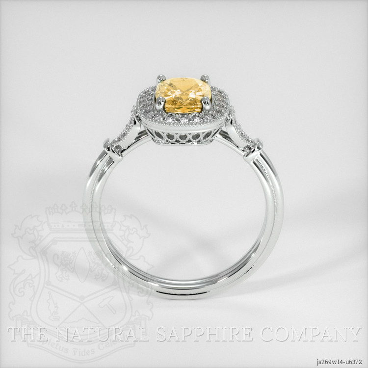 The ring features a beautiful, transparent 1.65 carat cushion shape yellowish brown sapphire with the dimensions of 7.42 x 5.93 x 4.08 mm and a mixed brilliant cut. It has a clarity grade of very slightly included (evaluated at eye level), intense color saturation, and an excellent polish. The origin of this sapphire is Madagascar.