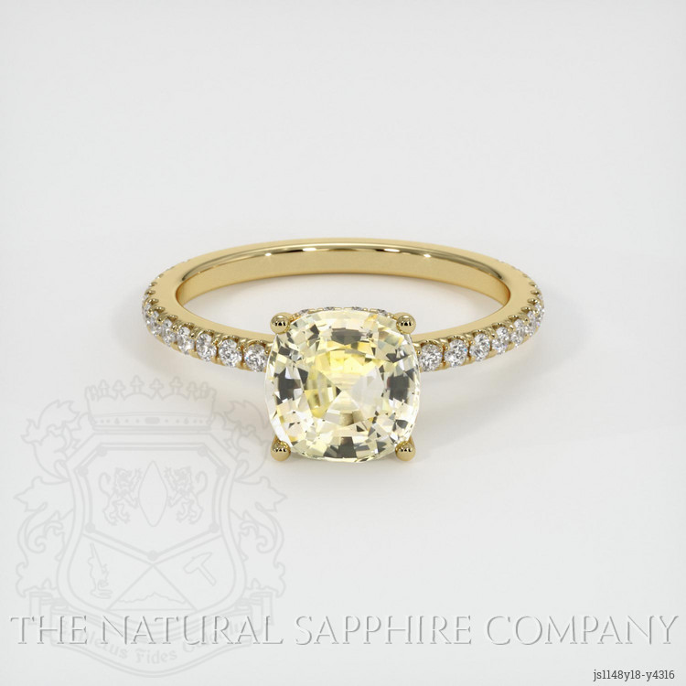 The ring features a beautiful, transparent AGL certified Yellow 2.28 carat cushion shape yellow sapphire with the dimensions of 7.58 x 7.46 x 4.69 mm and a mixed brilliant cut. It has a clarity grade of very slightly included (evaluated at eye level), medium light color saturation, and an excellent polish. The origin of this sapphire is Ceylon (Sri Lanka).
