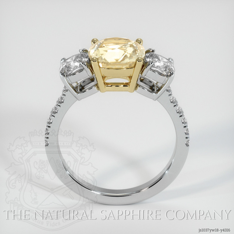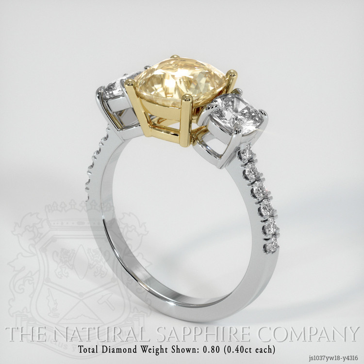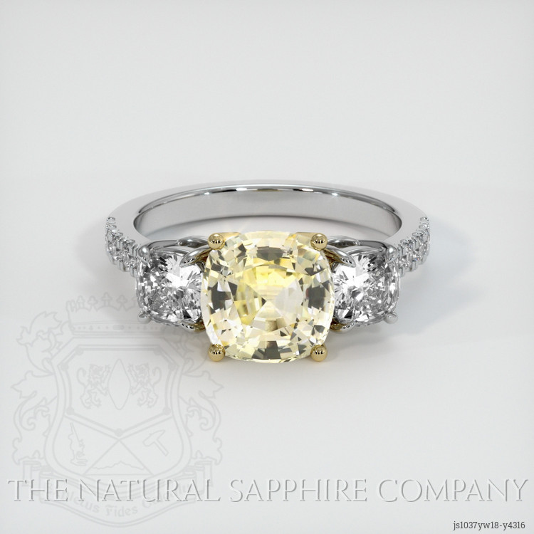 The ring features a beautiful, transparent AGL certified Yellow 2.28 carat cushion shape yellow sapphire with the dimensions of 7.58 x 7.46 x 4.69 mm and a mixed brilliant cut. It has a clarity grade of very slightly included (evaluated at eye level), medium light color saturation, and an excellent polish. The origin of this sapphire is Ceylon (Sri Lanka).