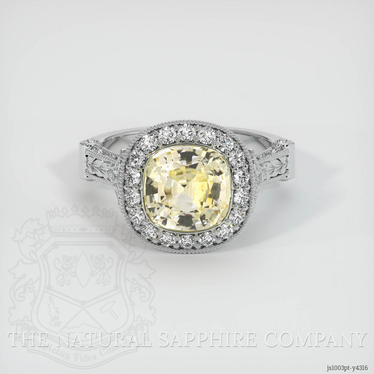 The ring features a beautiful, transparent AGL certified Yellow 2.28 carat cushion shape yellow sapphire with the dimensions of 7.58 x 7.46 x 4.69 mm and a mixed brilliant cut. It has a clarity grade of very slightly included (evaluated at eye level), medium light color saturation, and an excellent polish. The origin of this sapphire is Ceylon (Sri Lanka).