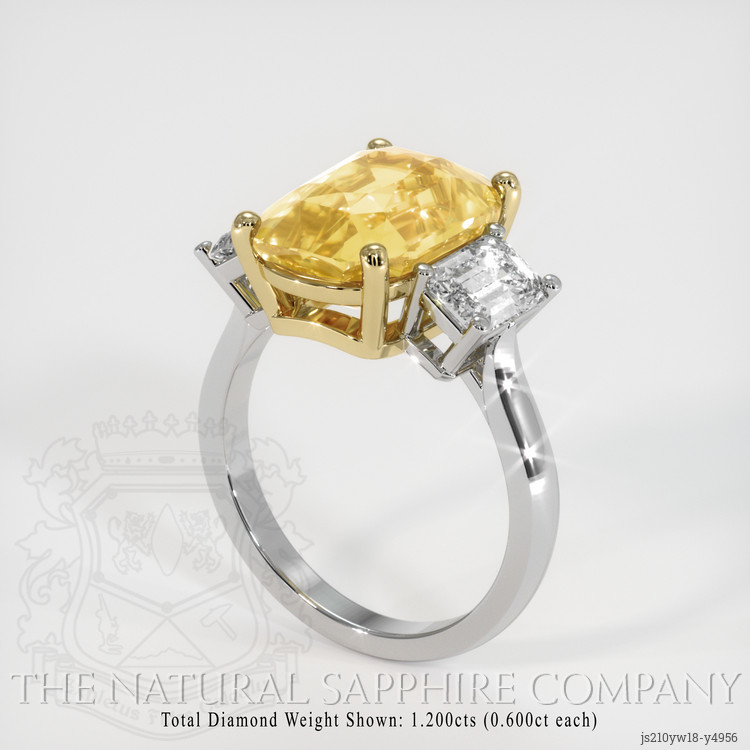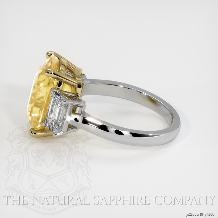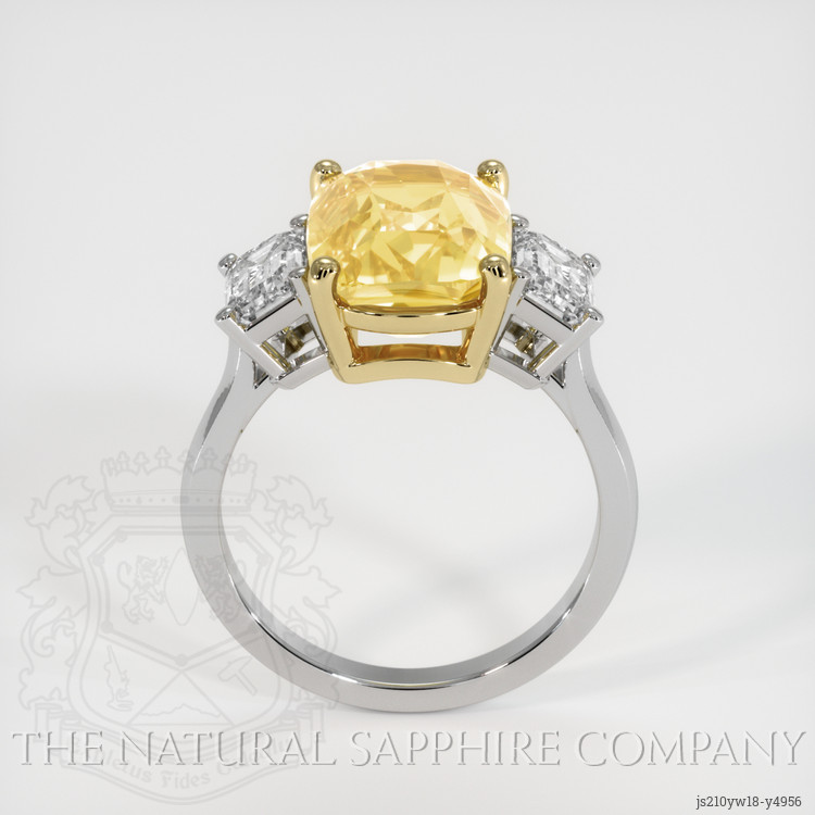 The ring features a beautiful, transparent 6.05 carat cushion shape yellow sapphire with the dimensions of 11.86 x 8.43 x 6.21 mm and a mixed brilliant cut. It has a clarity grade of eye clean (evaluated at eye level), medium color saturation, and an excellent polish. The origin of this sapphire is Ceylon(Sri Lanka).