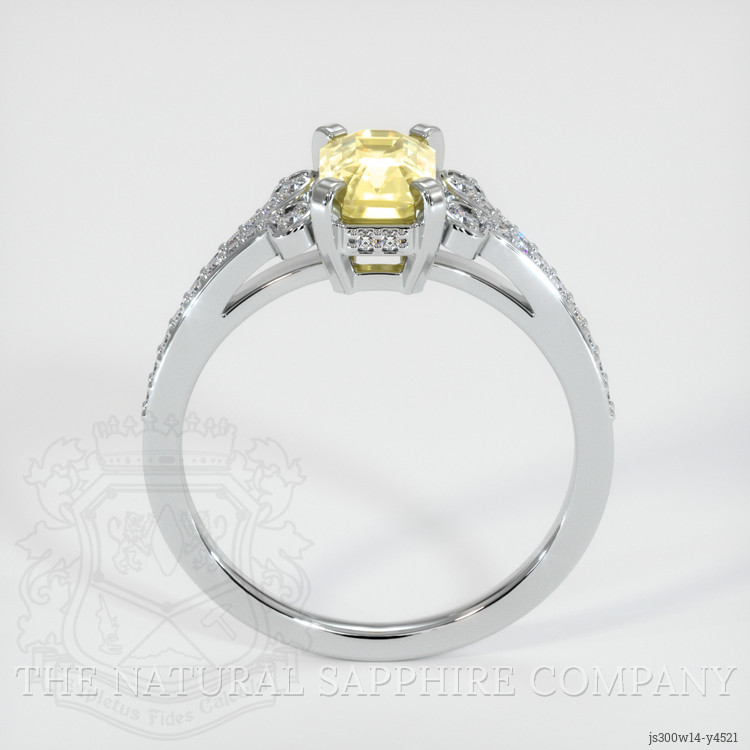 The ring features a beautiful, transparent 1.59 carat emerald shape yellow sapphire with the dimensions of 7.54 x 5.34 x 4.35 mm and a emerald cut. It has a clarity grade of very slightly included (evaluated at eye level), medium light color saturation, and an excellent polish. The origin of this sapphire is Ceylon (Sri Lanka).