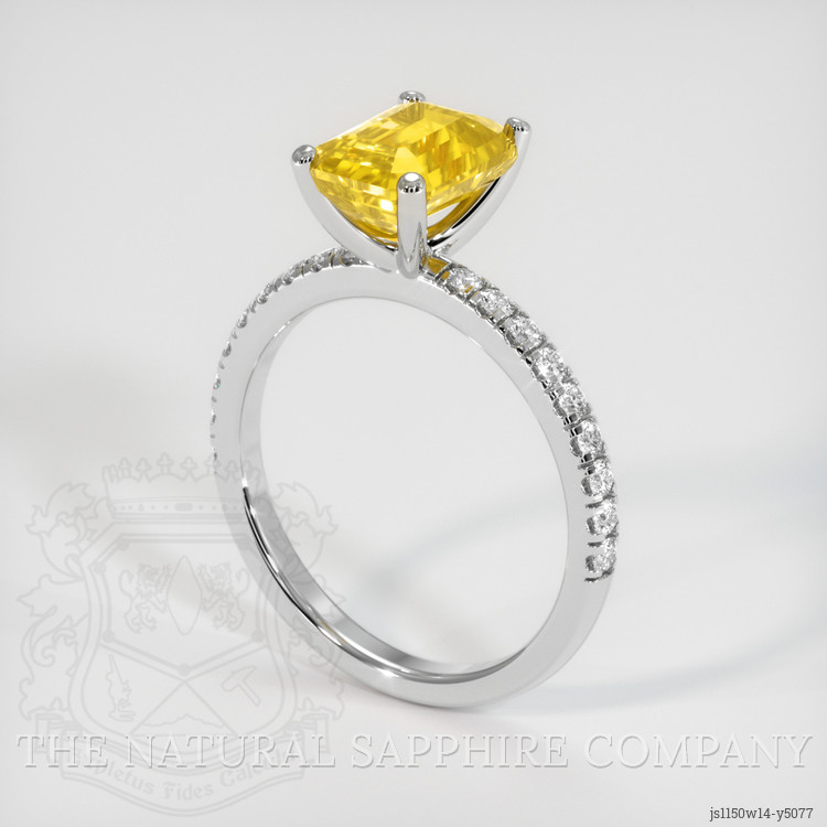 The ring features a beautiful, transparent 2.61 carat emerald cut shape yellow sapphire with the dimensions of 8.53 x 6.52 x 4.38 mm and a emerald cut. It has a clarity grade of very slightly included (evaluated at eye level), vivid color saturation, and an excellent polish. The origin of this sapphire is Ceylon (Sri Lanka).