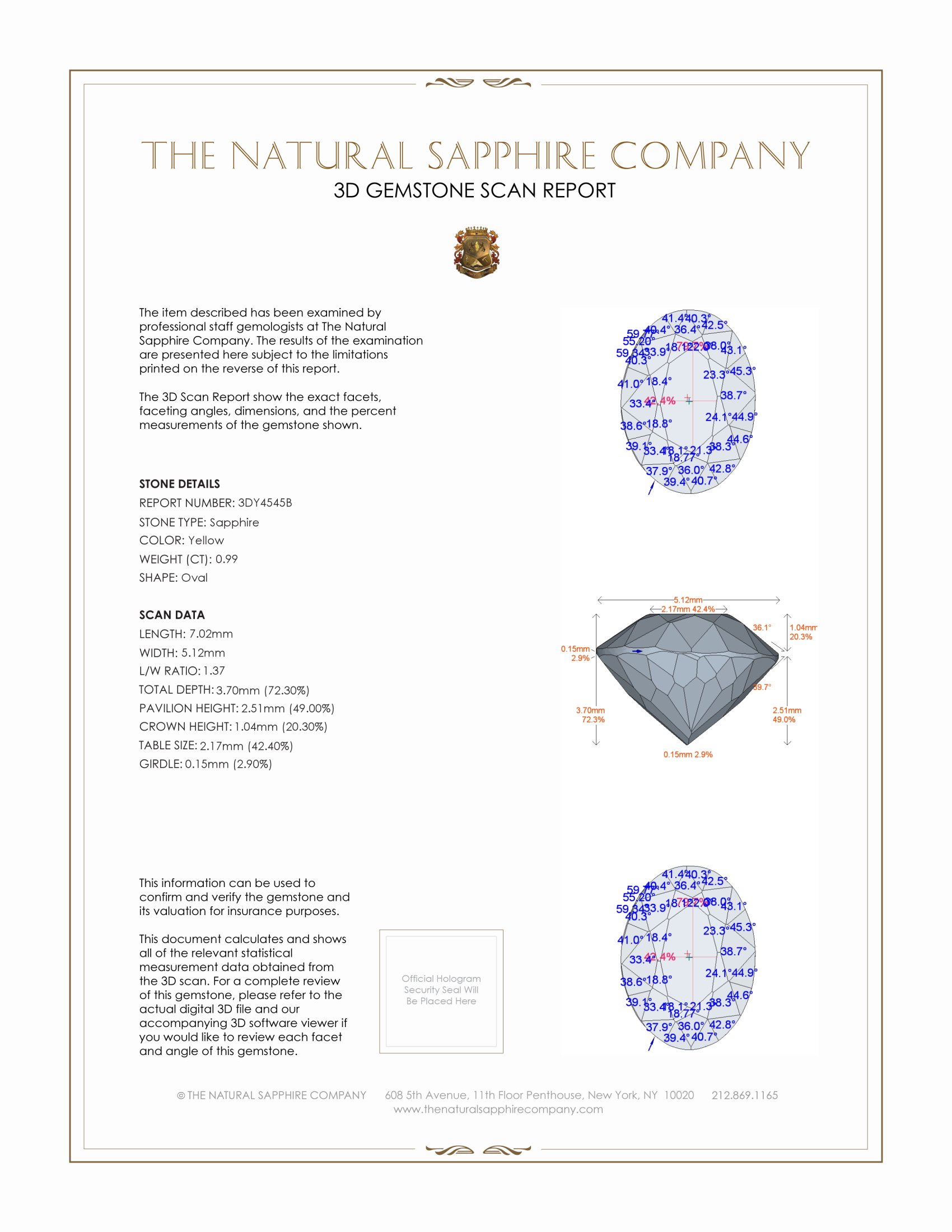 The ring features a beautiful, transparent 0.99 carat oval shape yellow sapphire with the dimensions of 7.02 x 5.12 x 3.70 mm and a mixed brilliant cut. It has a clarity grade of very slightly included (evaluated at eye level), medium intense color saturation, and an excellent polish. The origin of this sapphire is Ceylon (Sri Lanka).