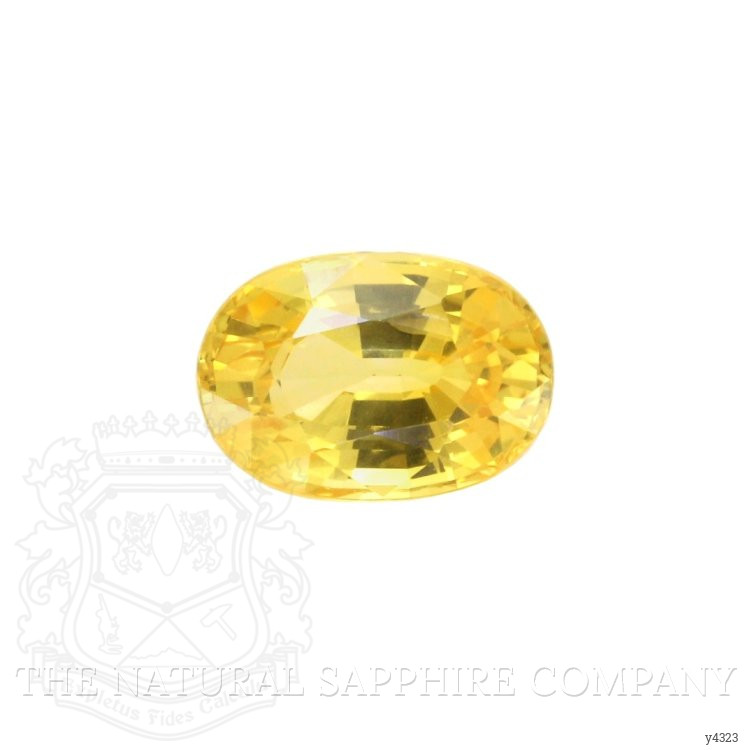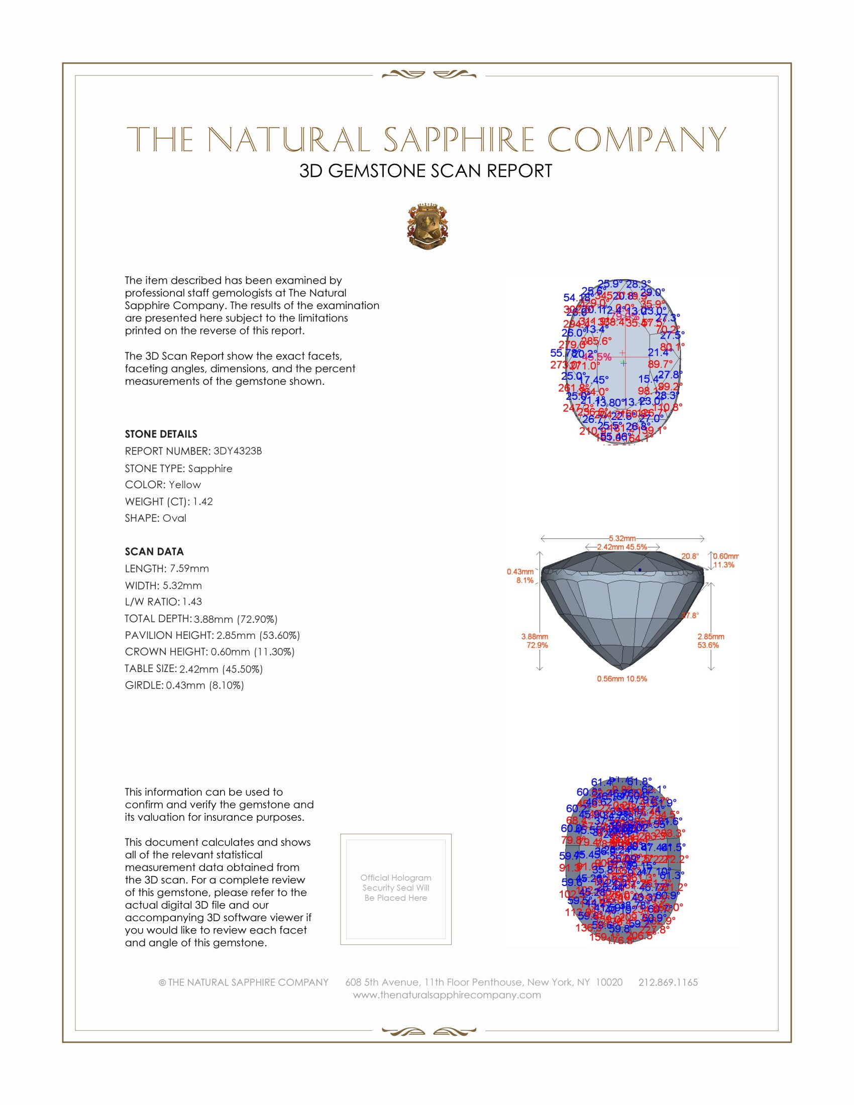 The ring features a beautiful, transparent 1.42 carat oval shape yellow sapphire with the dimensions of 7.58 x 5.32 x 3.87 mm and a mixed brilliant cut. It has a clarity grade of very slightly included (evaluated at eye level), intense color saturation, and an excellent polish. The origin of this sapphire is Ceylon.