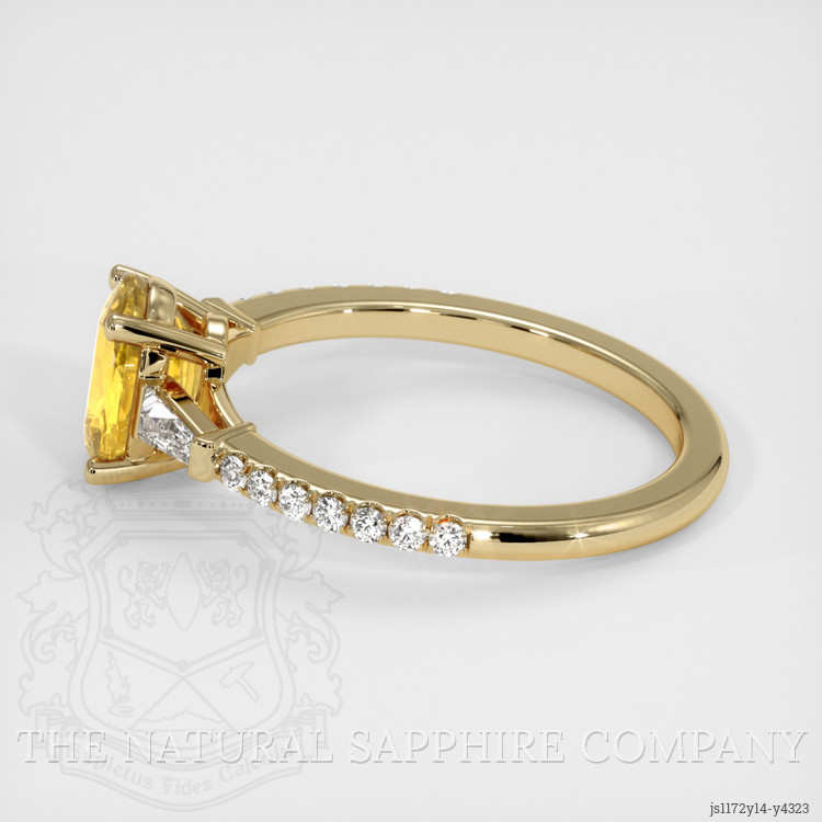 The ring features a beautiful, transparent 1.42 carat oval shape yellow sapphire with the dimensions of 7.58 x 5.32 x 3.87 mm and a mixed brilliant cut. It has a clarity grade of very slightly included (evaluated at eye level), intense color saturation, and an excellent polish. The origin of this sapphire is Ceylon.