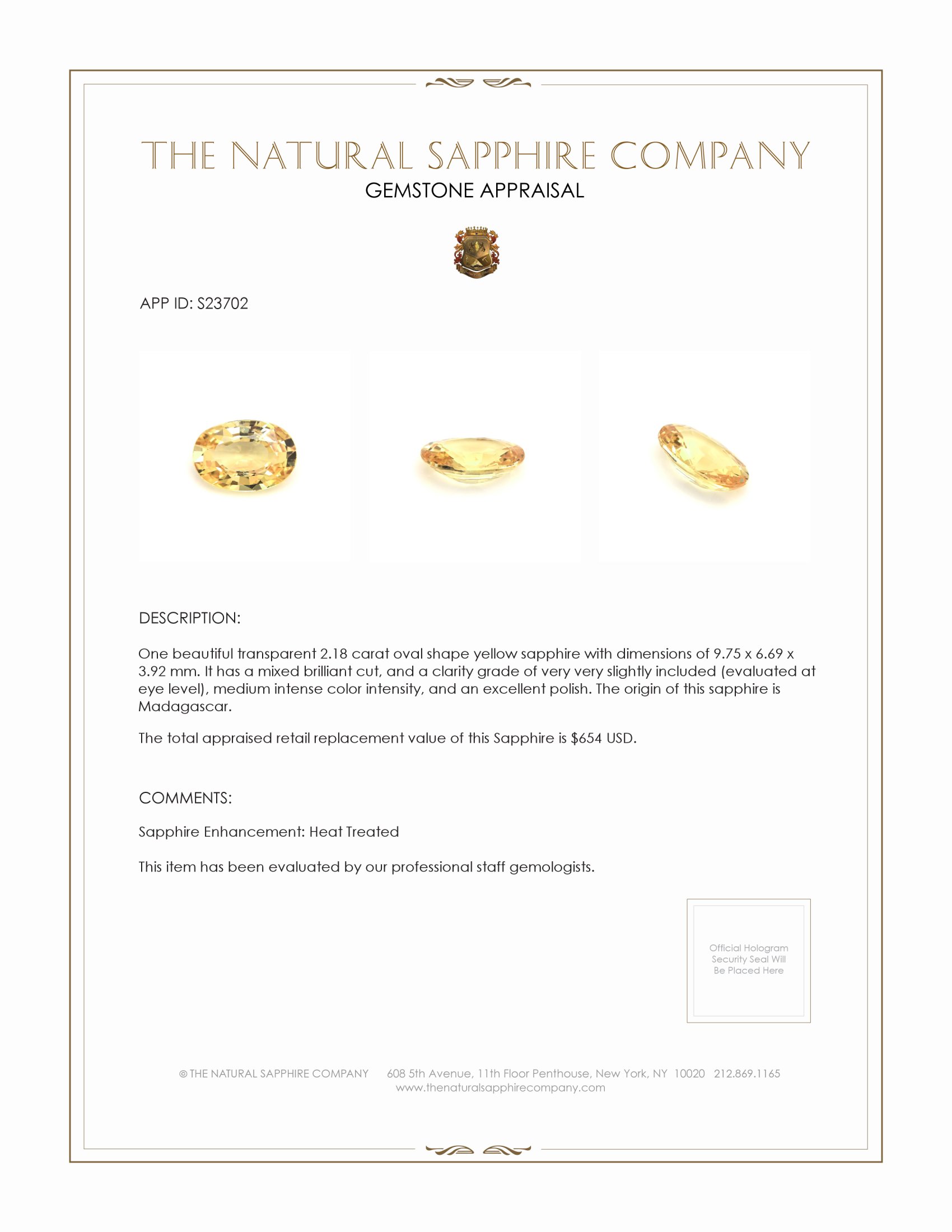 Discover an exquisite triumph of artistry and elegance with our 2.18 carat oval shape yellow sapphire ring, a masterpiece meticulously crafted by The Natural Sapphire Company. This opulent creation exudes both finesse and individuality, conceived with an eye for the truly unique and a reverence for nature's unparalleled beauty. At once a celebration of craftsmanship and ethical integrity, this ring promises not only a distinction in beauty but also a statement of values. It beckons the discerning individual who can appreciate both magnificence and meaningful origin, inducted into a lineage of luxury where conscience and connoisseurship coexist.