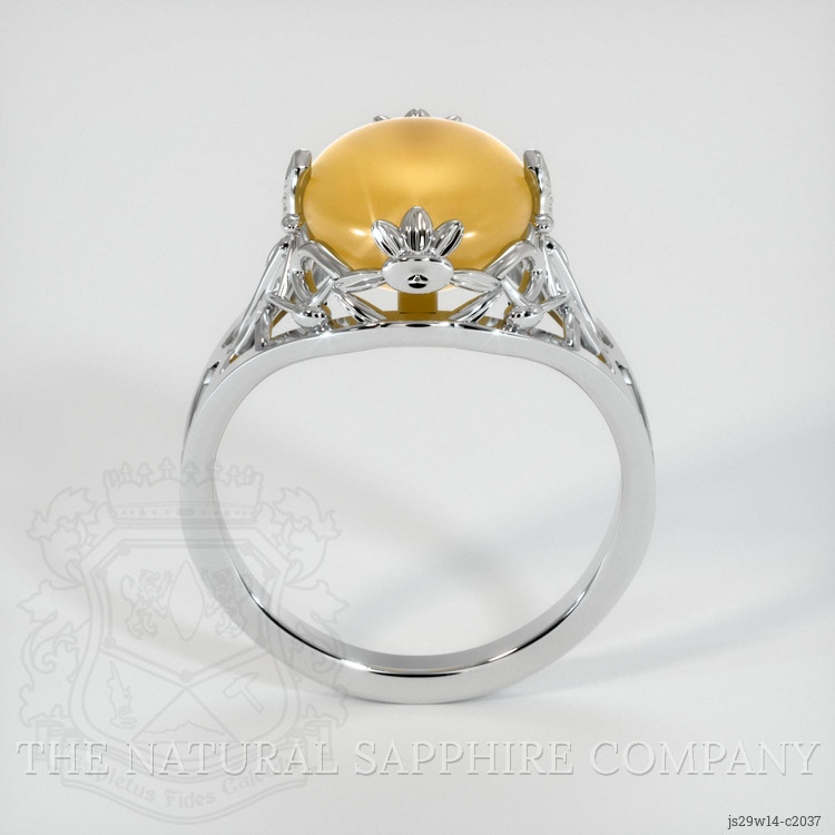 The ring features a beautiful, translucent 5.83 carat oval shape yellow sapphire with the dimensions of 10.80 x 9.20 x 5.30 mm and a cabochon cut. It has a clarity grade of slightly included (evaluated at eye level), light color saturation, and an excellent polish. The origin of this sapphire is Ceylon (Sri Lanka).