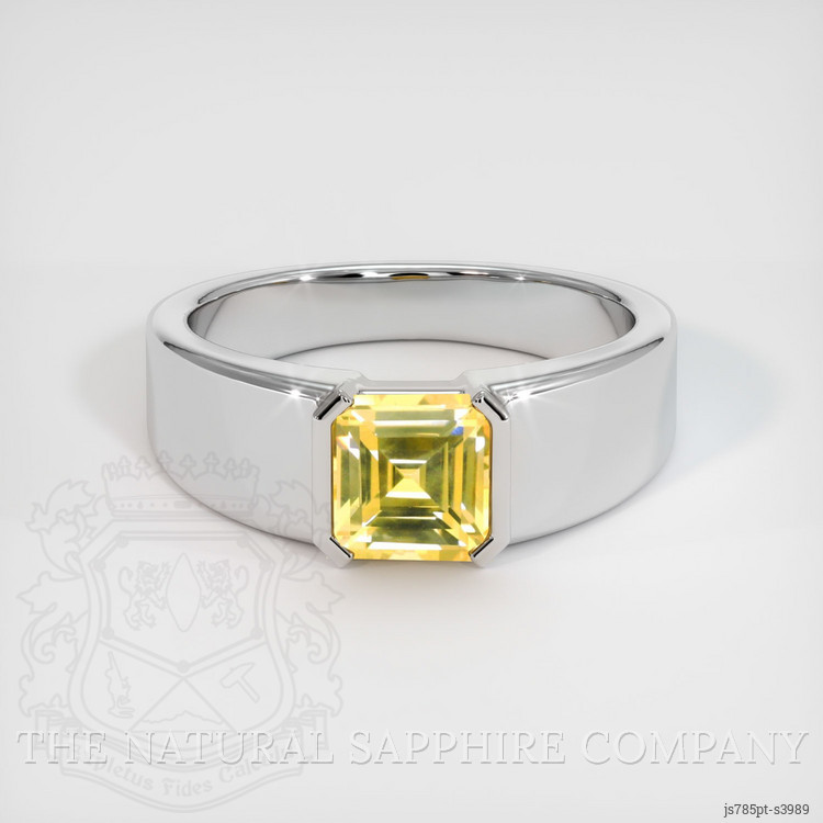 The men's ring features a beautiful, transparent 1.61 carat princess shape yellow sapphire with the dimensions of 6.26 x 6.23 x 4.30 mm and a princess cut. It has a clarity grade of eye clean (evaluated at eye level), intense color saturation, and an excellent polish. The origin of this sapphire is Ceylon (Sri Lanka).