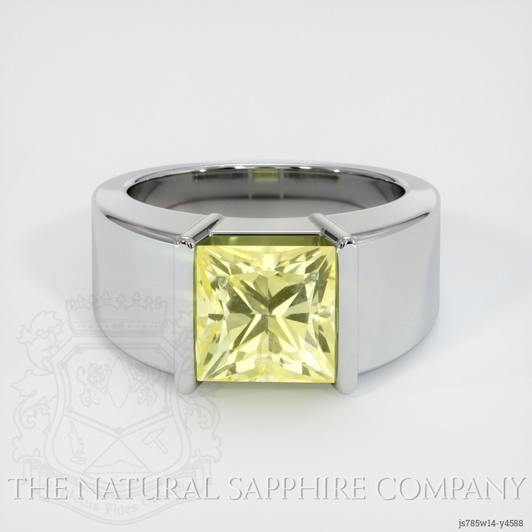 The men's ring features a beautiful, transparent 4.04 carat princess shape yellow sapphire with the dimensions of 8.30 x 8.29 x 6.28 mm and a princess cut. It has a clarity grade of very slightly included (evaluated at eye level), medium intense color saturation, and an excellent polish. The origin of this sapphire is Ceylon (Sri Lanka).