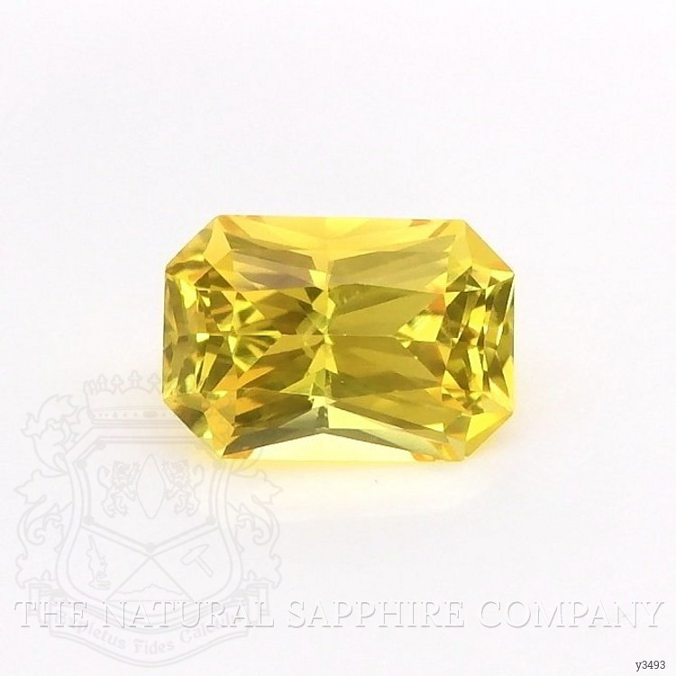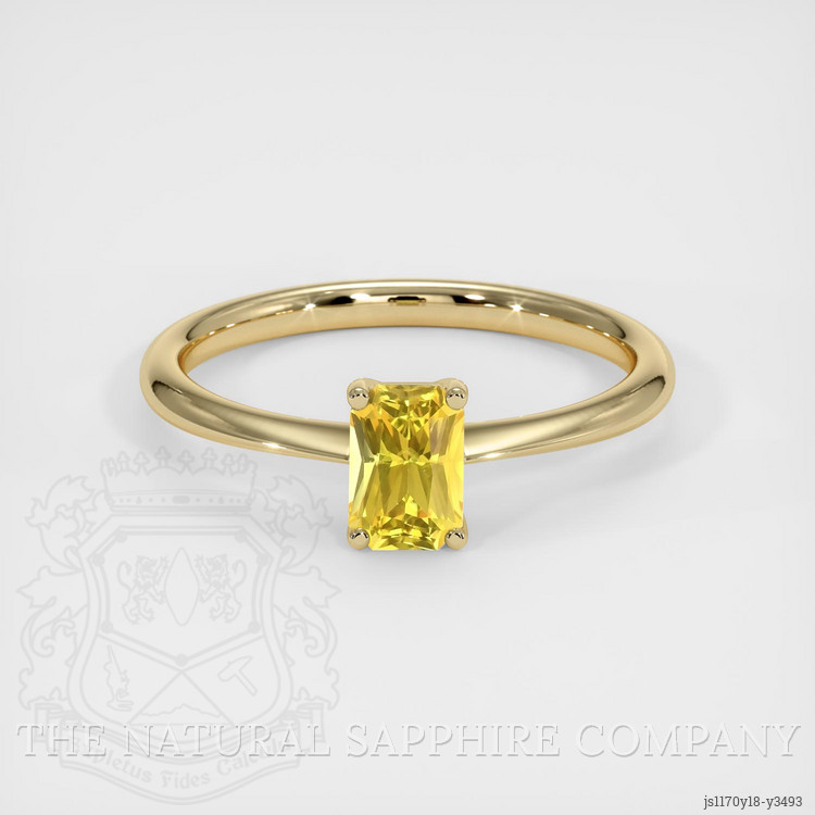 The ring features a beautiful, transparent 0.64 carat radiant shape yellow sapphire with the dimensions of 5.86 x 4.05 x 3.09 mm and a radiant cut. It has a clarity grade of very slightly included (evaluated at eye level), intense color saturation, and an excellent polish. The origin of this sapphire is Ceylon (Sri Lanka).