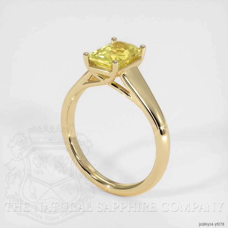 The ring features a beautiful, transparent 1.53 carat radiant shape yellow sapphire with the dimensions of 7.60 x 6.03 x 3.70 mm and a radiant cut. It has a clarity grade of very slightly included (evaluated at eye level), medium intense color saturation, and an excellent polish. The origin of this sapphire is Ceylon (Sri Lanka).