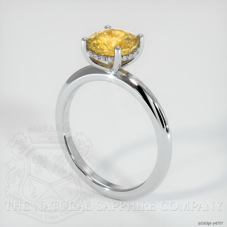 The ring features a beautiful, transparent 2.05 carat round shape yellow sapphire with the dimensions of 7.39 x 7.31 x 4.72 mm and a mixed brilliant cut. It has a clarity grade of eye clean (evaluated at eye level), intense color saturation, and an excellent polish. The origin of this sapphire is Ceylon (Sri Lanka).