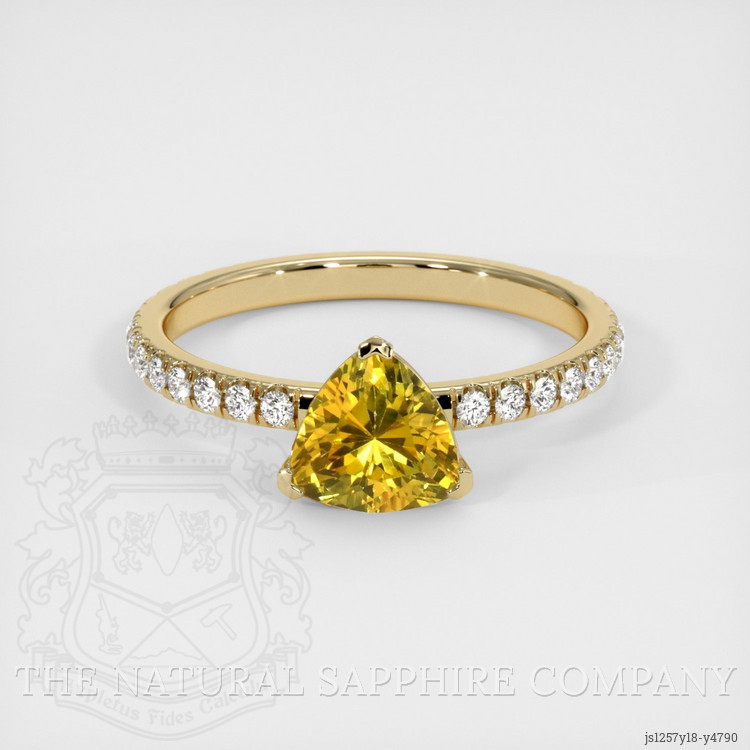 The ring features a beautiful, transparent 0.79 carat trillion shape yellow sapphire with the dimensions of 6.02 x 5.81 x 3.54 mm and a trillion cut. It has a clarity grade of very slightly included (evaluated at eye level), intense color saturation, and an excellent polish. The origin of this sapphire is Ceylon (Sri Lanka).