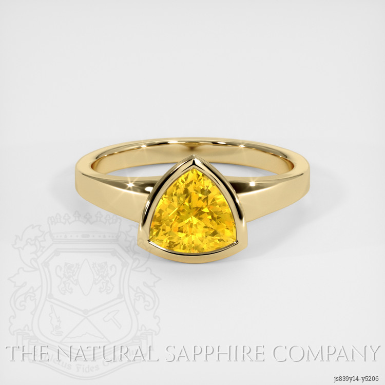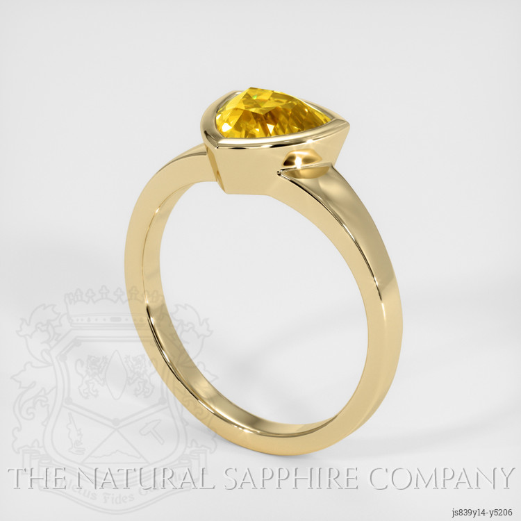 The ring features a beautiful, transparent 1.56 carat trillion shape yellow sapphire with the dimensions of 7.08 x 7.06 x 4.79 mm and a trillion cut. It has a clarity grade of very slightly included (evaluated at eye level), intense color saturation, and an excellent polish. The origin of this sapphire is Ceylon (Sri Lanka).