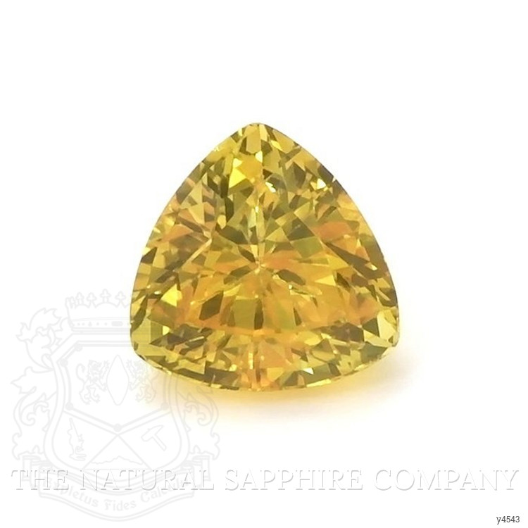 The ring features a beautiful, transparent 1.84 carat trillion shape yellow sapphire with the dimensions of 7.06 x 6.96 x 4.96 mm and a trillion cut. It has a clarity grade of eye clean (evaluated at eye level), medium intense color saturation, and an excellent polish. The origin of this sapphire is Ceylon (Sri Lanka).