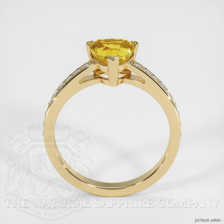 The ring features a beautiful, transparent 1.84 carat trillion shape yellow sapphire with the dimensions of 7.06 x 6.96 x 4.96 mm and a trillion cut. It has a clarity grade of eye clean (evaluated at eye level), medium intense color saturation, and an excellent polish. The origin of this sapphire is Ceylon (Sri Lanka).
