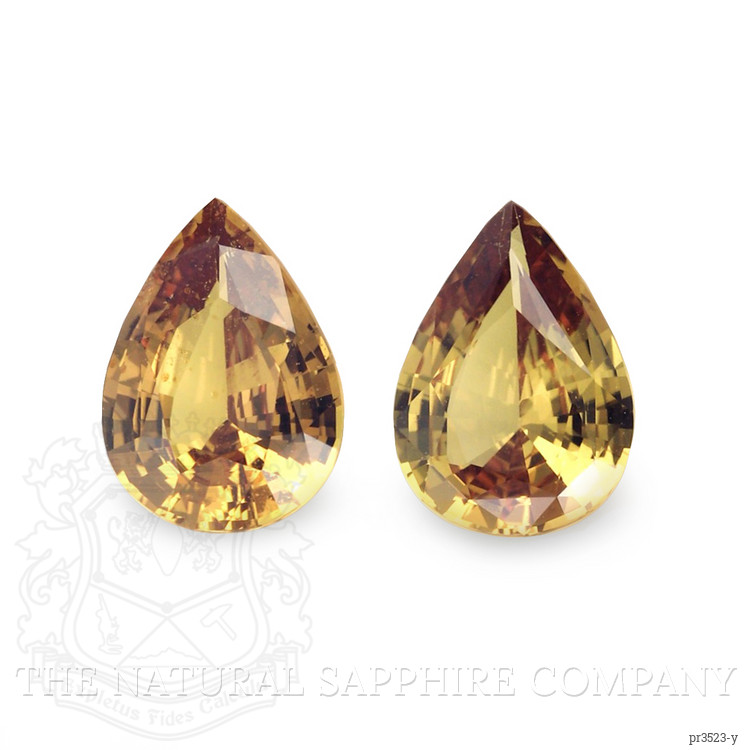 The earrings feature a beautiful, transparent pair of sapphires that are 2.79 total carat weight. They are pear shape yellowish brown sapphires, with the dimensions of 8.83 x 6.38 x 3.53 mm and are mixed brilliant cut, have a clarity grade of eye clean (evaluated at eye level), vivid color saturation, and an excellent polish. The origin of this pair of sapphires is Ceylon (Sri Lanka).