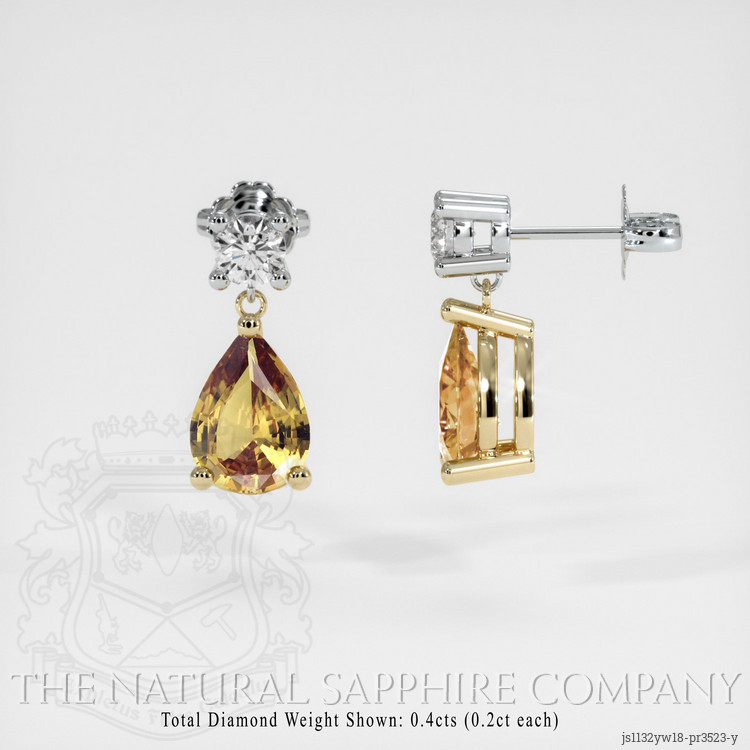The earrings feature a beautiful, transparent pair of sapphires that are 2.79 total carat weight. They are pear shape yellowish brown sapphires, with the dimensions of 8.83 x 6.38 x 3.53 mm and are mixed brilliant cut, have a clarity grade of eye clean (evaluated at eye level), vivid color saturation, and an excellent polish. The origin of this pair of sapphires is Ceylon (Sri Lanka).