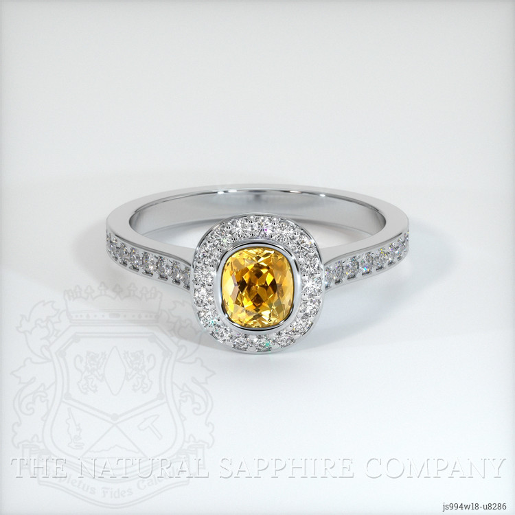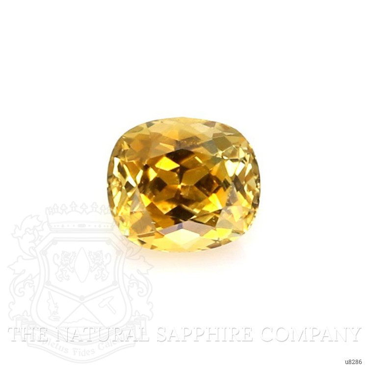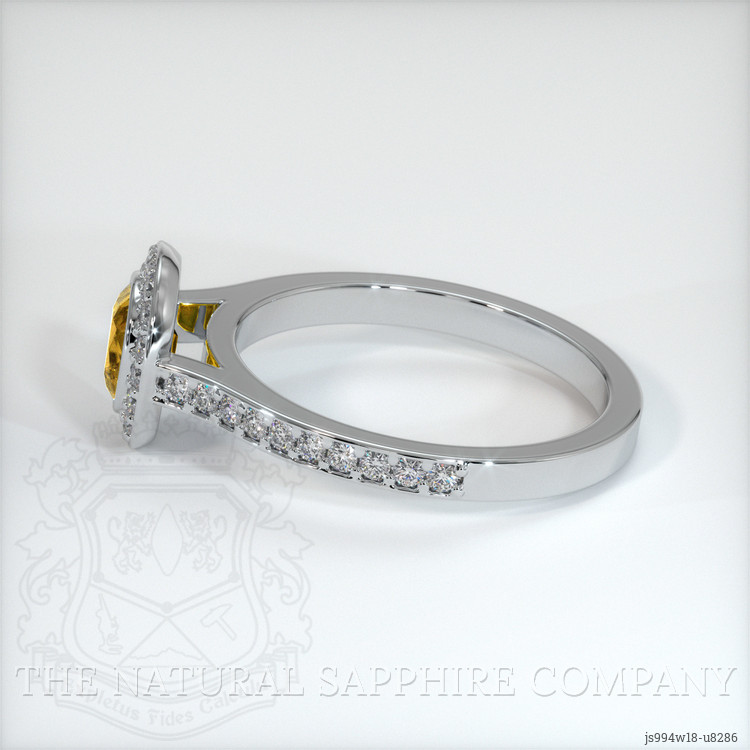 The ring features a beautiful, transparent 0.74 carat cushion shape yellowish brown sapphire with the dimensions of 5.16 x 4.53 x 3.54 mm and a mixed brilliant cut. It has a clarity grade of very slightly included (evaluated at eye level), intense color saturation, and an excellent polish. The origin of this sapphire is Montana.