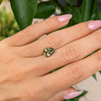 The ring features a beautiful, transparent 3.07 carat pear shape yellowish brown sapphire with the dimensions of 10.20 x 7.14 x 5.41 mm and a mixed brilliant cut. It has a clarity grade of very slightly included (evaluated at eye level), intense color saturation, and an excellent polish. The origin of this sapphire is Madagascar.