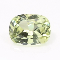 The ring features a beautiful, transparent 0.77 carat cushion shape yellowish green sapphire with the dimensions of 6.44 x 4.97 x 3.02 mm and a mixed brilliant cut. It has a clarity grade of very slightly included (evaluated at eye level), medium color saturation, and an excellent polish. The origin of this sapphire is Montana.