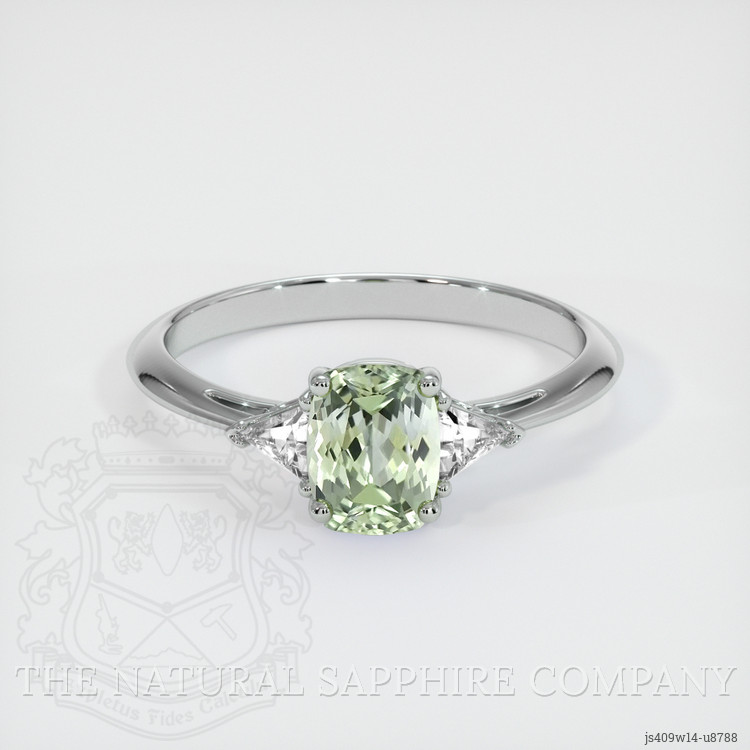 The ring features a beautiful, transparent 0.95 carat cushion shape yellowish green sapphire with the dimensions of 6.55 x 4.76 x 3.30 mm and a mixed brilliant cut. It has a clarity grade of eye clean (evaluated at eye level), medium intense color saturation, and an excellent polish. The origin of this sapphire is Montana.