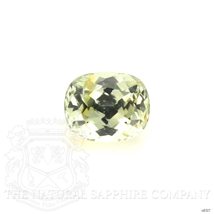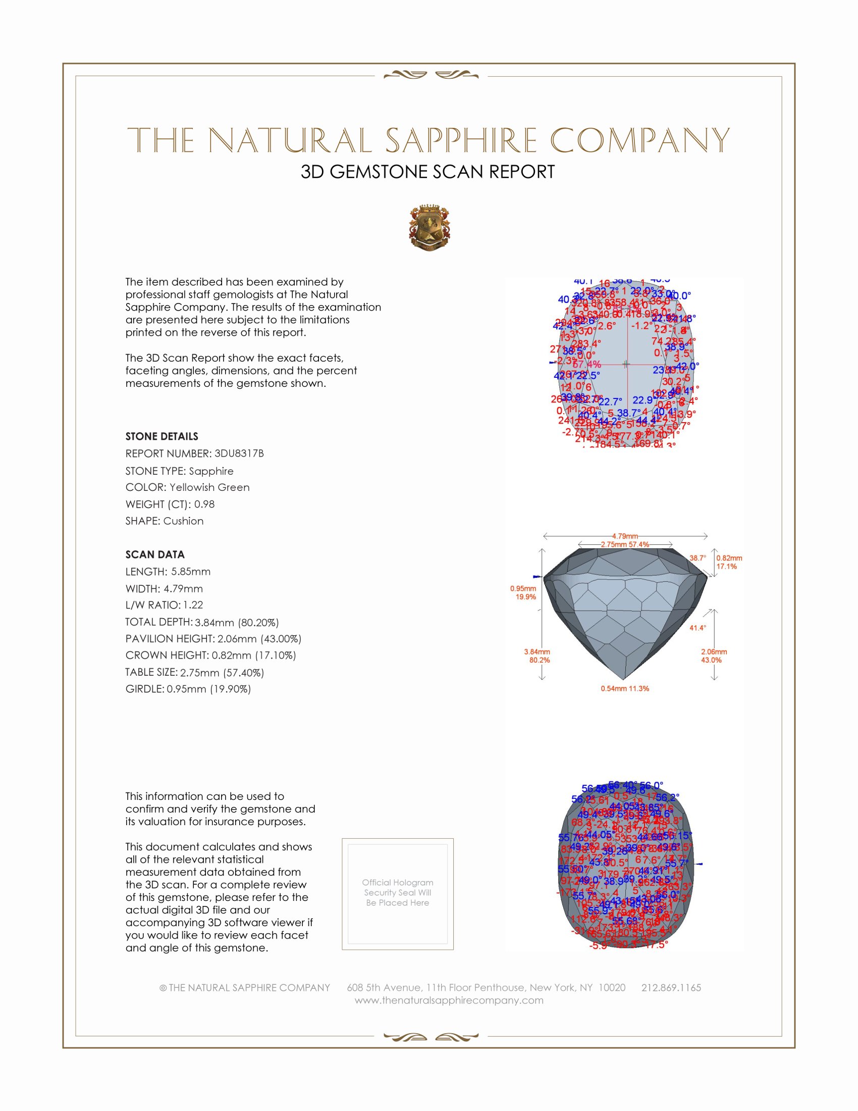 The ring features a beautiful, transparent 0.98 carat cushion shape yellowish green sapphire with the dimensions of 5.85 x 4.79 x 3.84 mm and a mixed brilliant cut. It has a clarity grade of eye clean (evaluated at eye level), medium light color saturation, and an excellent polish. The origin of this sapphire is Montana.