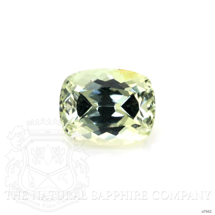 The ring features a beautiful, transparent 1.09 carat cushion shape yellowish green sapphire with the dimensions of 6.51 x 5.25 x 3.71 mm and a mixed brilliant cut. It has a clarity grade of very slightly included (evaluated at eye level), medium intense color saturation, and an excellent polish. The origin of this sapphire is Montana.
