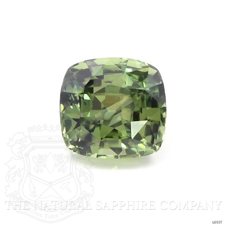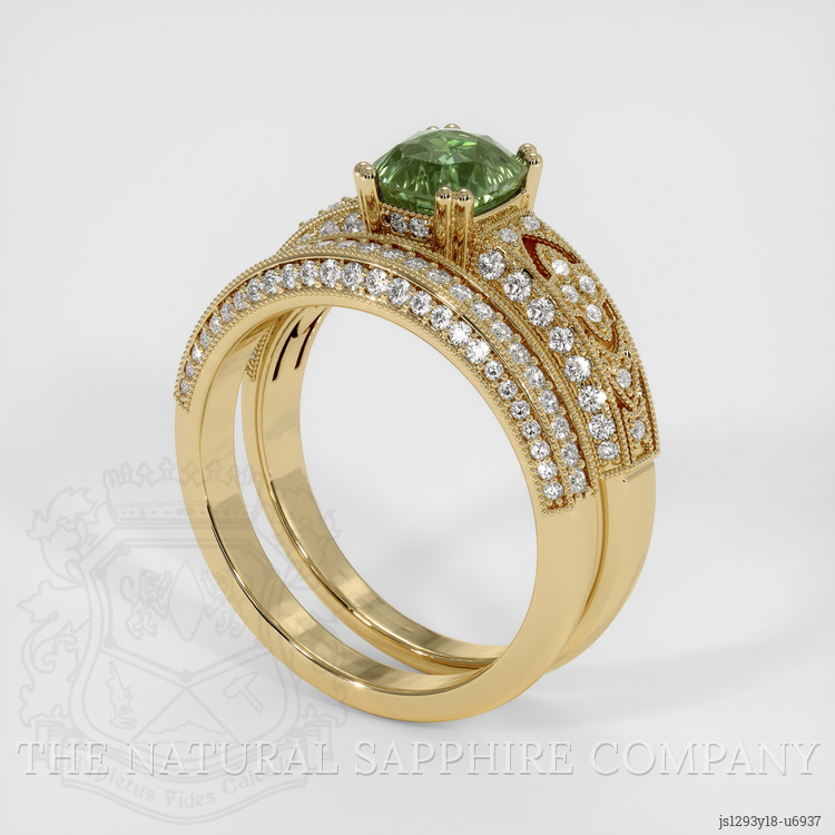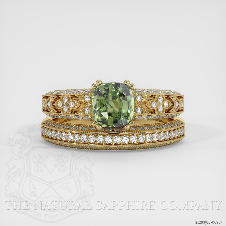The ring features a beautiful, transparent 1.34 carat cushion shape yellowish green sapphire with the dimensions of 5.87 x 5.58 x 4.53 mm and a mixed brilliant cut. It has a clarity grade of very slightly included (evaluated at eye level), intense color saturation, and an excellent polish. The origin of this sapphire is Montana.